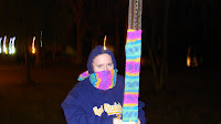 We left several cozies last night. They will probably be the last of 2008. We have a couple more which may be done tonight, but I'll probably wait till 2009 to hang them. Last night, even though it was midnight on a Tuesday, there were plenty of people out and a few saw us. I can only imagine that there will be more out on New Year's Eve. In addition to the three pictured here, we also left two antenna cozies but we did not risk taking pictures of them. These cozies are on the one way sign at the YMCA (I seem to like one-way signs!) on a historic light pole on Washington Avenue, and a scarf for the bear statue in the Parkersburg City Park in case he got chilly! Enjoy!